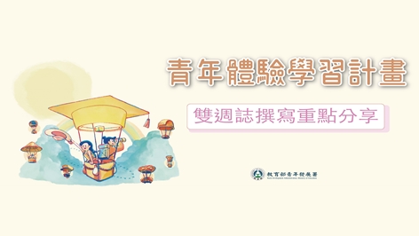 「青年教育與就業儲蓄帳戶方案-青年體驗學習計畫」由教育部青年發展署辦理,鼓勵高中職應屆畢業生於國內外進行體驗學習,多方面探索性向與興趣,找到未來人生方向。體驗學習類型包含志願服務、壯遊探索、達人見習、創業見習、社區見習、其他等。 「雙週誌撰寫重點分享」線上課程影片,由本計畫輔導服務團隊-國立臺灣師範大學教育心理與輔導學系田秀蘭教授,為參與計畫青年深入淺出的解說雙週誌撰寫重點,如何記錄體驗學習企劃執行期間的觀察、思考與感受,並舉例學長姐的心得文字。青年透過影片內容可更進一步了解雙週誌的意義及撰寫方向。 本計畫內容,可至壯遊體驗學習網( https://youthtravel.tw/ )、教育部青年發展署官網 ( https://reurl.cc/XlL1LM )瀏覽。