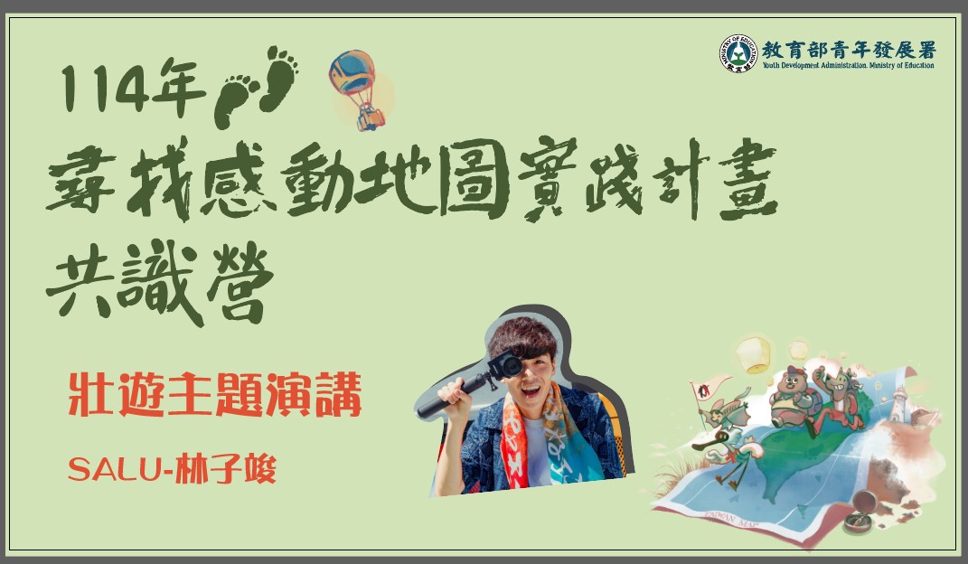 邀請 106年壯遊團隊成員、影音創作者 SALU - 林子竣 分享壯遊挑戰與心態建立,鼓舞青年將模糊的夢想轉化為可實踐的目標。 「去感受旅程帶給你的意義。」—SALU