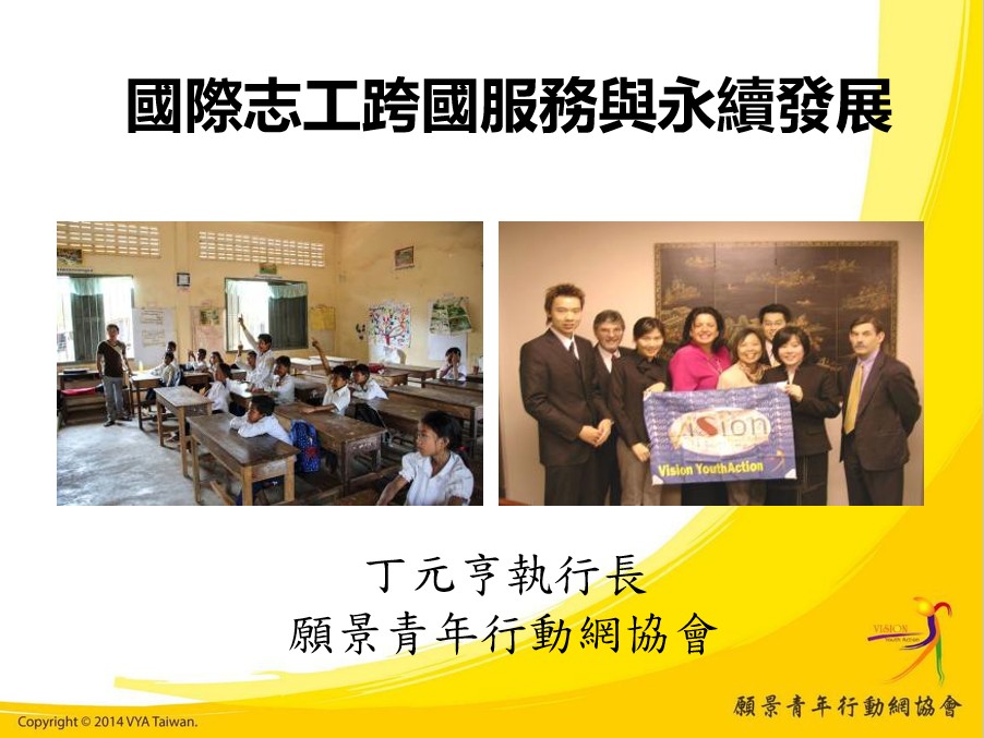 專長在於青年參與公共事務、志願服務、服務學習、社區發展與國際青年交流等領域,並與全球80 國90 NGOs 一起推動上述各項工作。